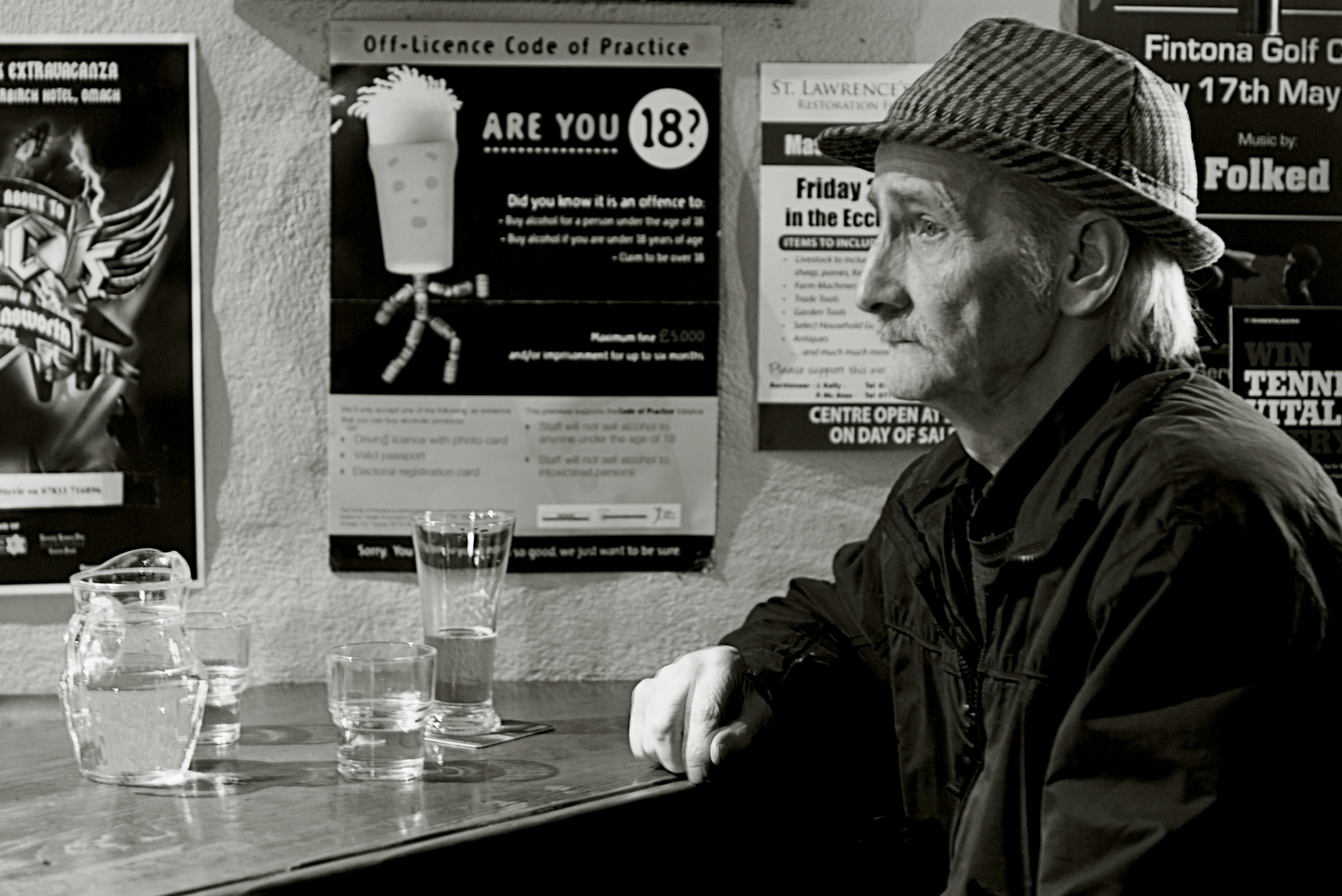 He is nearly always there. At McGlinn on the Highstreet in Fintona in Northern-Ireland. On a bar stool, near the outside door. And always on that spot, on the head of the counter. His name? Sorry, I don’t know. ‘He can be vibrant’, says Paul McGlinn, owner of the pub. I never noticed that. Just like his arrival or departure. He is simply there. Like his hat, that he’ll never put off.