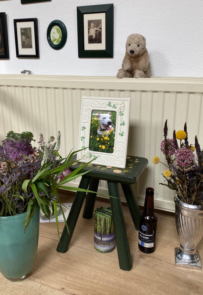 Dat plekje in huis wordt gekoesterd. Er staan bloemen. We missen het getippel van haar pootjes op de houten vloer. Haar stunts bovenaan de trap loerend: waar is Mirjam? Haar oogjes die bij voortduring op ons waren gericht, maar die steeds minder konden zien. De blijheid bij het zien van de hele familie, exclusief andere hondjes. De blafjes in haar slaap, steeds vaker naarmate ze ouder werd. Haar vaste rondjes aan de Kippenkade. Haar snuffelen in het groen en achterpootjes die met de maand minder kracht hadden. Lieve, lieve Sam. Het is goed geweest. Wat was je mooi en intelligent en wat heb je ons veel gegeven. Je bent voor altijd onze kleine grote vriend.”